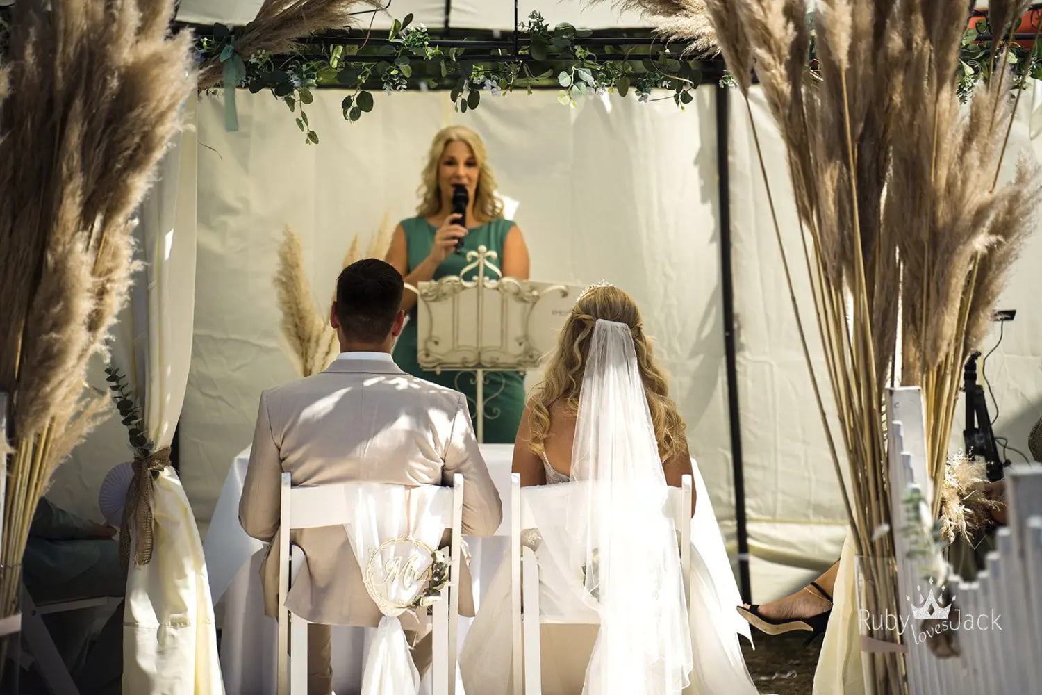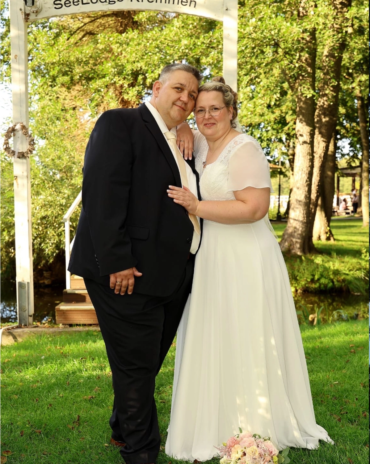 Wir hatten viele Termine zwecks Planung, was wir alles haben wollen. Waren auch viel bei Whatsapp im Kontakt. Man konnte Tag und Nacht schreiben. Sie hat uns noch viele weitere wertvolle Tipps gegeben zur Hochzeit. Und schwups … da war der Tag. Am 20.07.2024 haben wir in der Saubucht in Marwitz geheiratet. Sie hat eine soooooo tolle Rede gehalten. Sie war emotional, liebevoll, sehr detailreich und wunderschön.